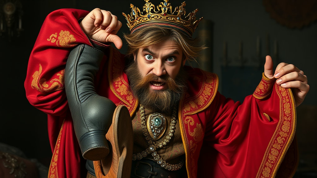 산적은 겁에 질려서 옷을 입으려 애썼지만, 한 번도 본 적 없는 화려하고 복잡한 왕의 의복을 어찌 입을 줄 알겠습니까. 결국 소매에 발을 집어넣거나, 허리에 매는 장신구를 머리에 뒤집어쓰는 등, 엉망으로 걸쳤습니다.