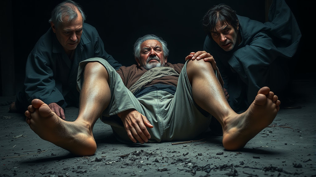 어느 날, 제자 '갑'이 스승에게서 안마를 해달라는 부탁을 받았습니다. 그때 '갑'은 '을'이 맡고 있던 스승의 다른 쪽 다리를 몰래 돌로 내리쳐 부러뜨리고 말았습니다.