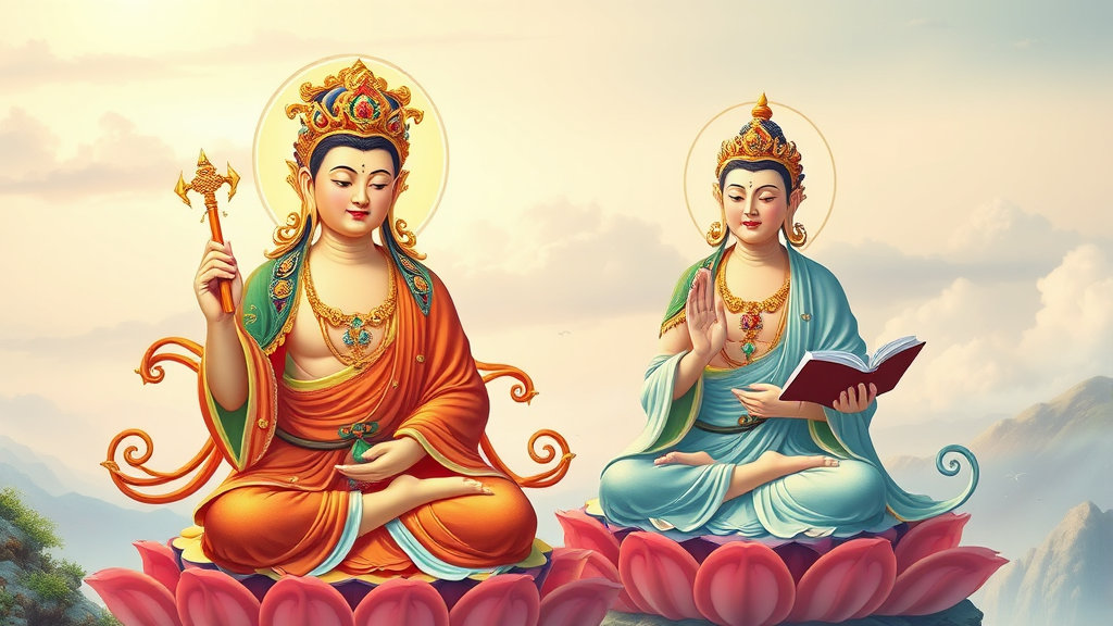 #문수보살(文殊菩薩)---문수보살은 산스크리트어로 만주슈리(Majushri)이고, 문수사리보살(文殊師利菩薩), 만수실리보살(曼殊室利菩薩), 문수시리(文殊尸利), 묘길상(妙吉祥)이라고도 표기되는 보살이다. 문수(文殊)와 만수(曼殊)는 묘(妙)의 뜻이고, 사리(師利)와 시리(尸利)는 덕(德), 길상(吉祥)의 뜻이다. 이 보살은 석가모니부처님의 교화를 돕기 위해 일시적인 권현(權現=化身=權化)으로 보살의 자리에 있다고 한다.