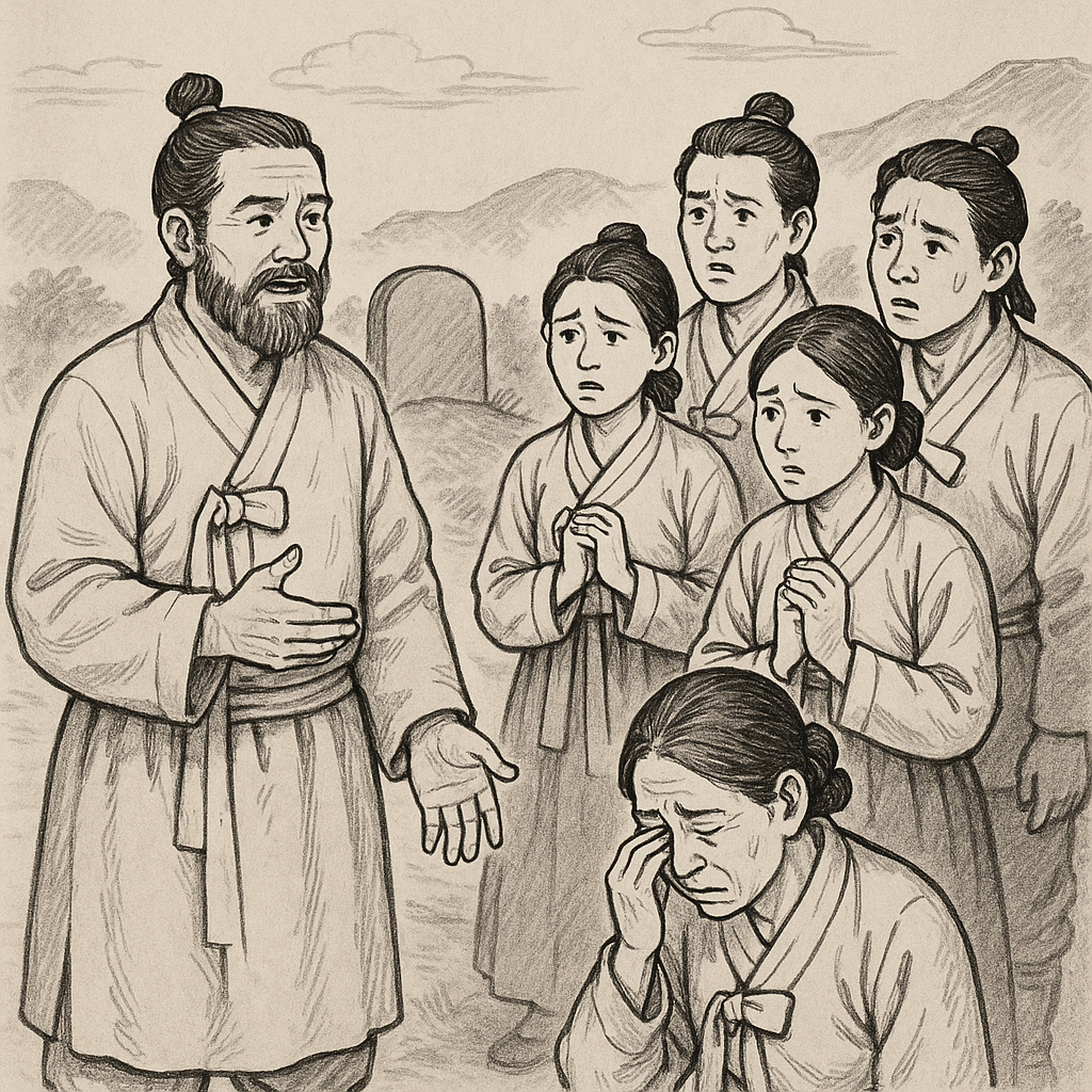 김씨 성을 가진 자가 어느 날 세상을 떠나자, 그의 자녀들은 깊은 슬픔 속에서 정성을 다해 장례를 치렀다.