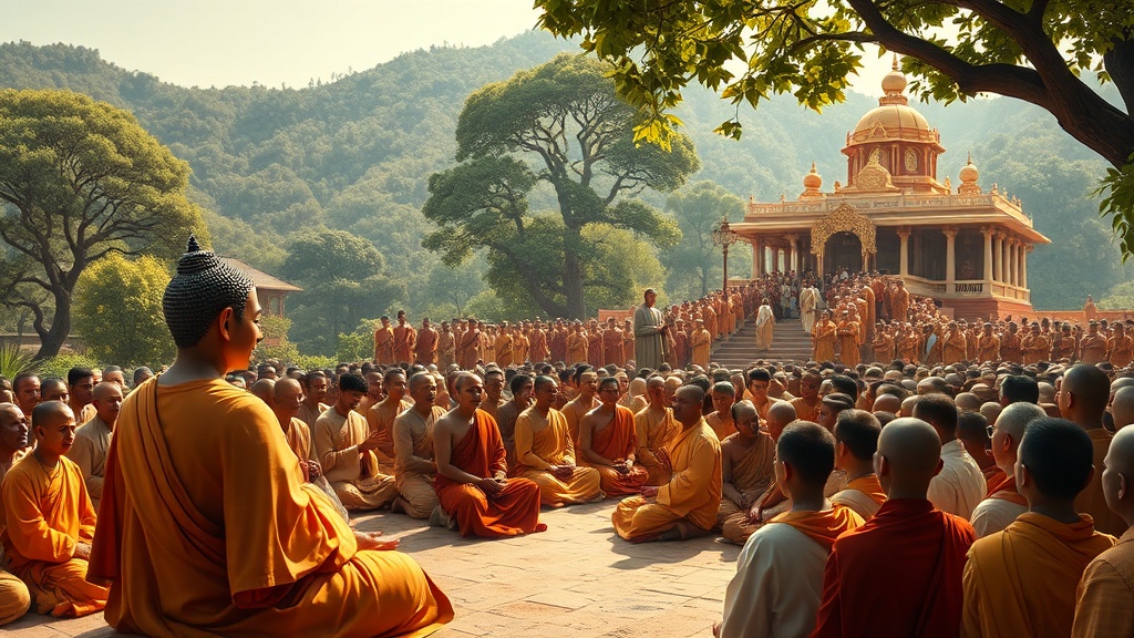 옛날 옛날 아주 먼 옛날에, 마음이 바다처럼 넓은 부처님이 살고 계셨어요. 부처님은 언제나 사람들에게 '착한 마음'과 '바른 행동'을 가르쳐 주셨죠. 어느 날, 부처님께서 제자들과 함께 옆 마을 왕궁으로 점심 식사를 하러 가시던 길이었어요.