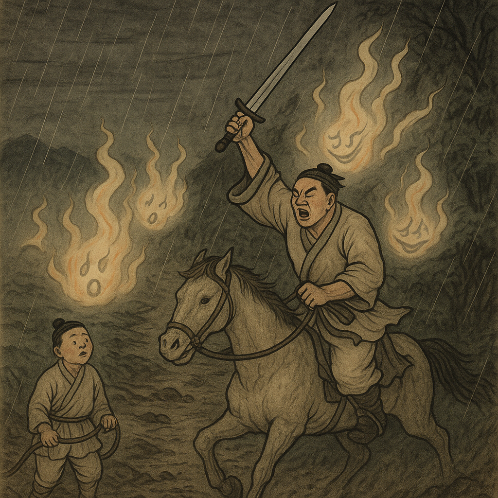 결국 그는 칼을 뽑아들고, 크게 소리치며 도깨비불 속으로 그대로 돌진했다.