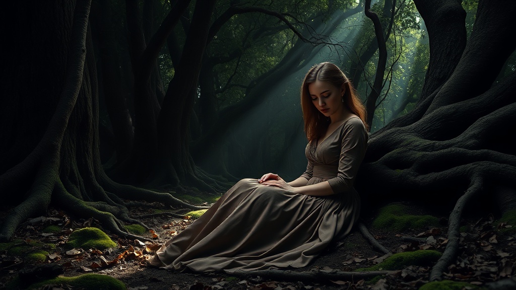 한글원문 (Original Korean): 슬픔을 견디지 못한 그녀는 결국 집을 나와 산속으로 들어갔고, 살아갈 의지를 잃은 채 모든 것을 포기하고 싶은 심정이었습니다.