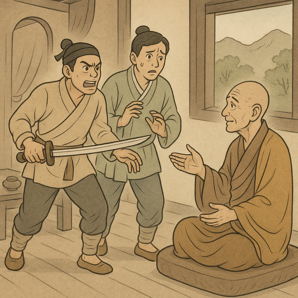 암자 안에는 한 노스님이 앉아 있었다. 스님은 두 사람의 거친 숨결과 긴박한 분위기를 느끼고 까닭을 물었다.