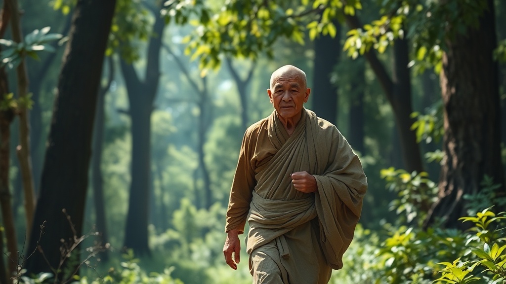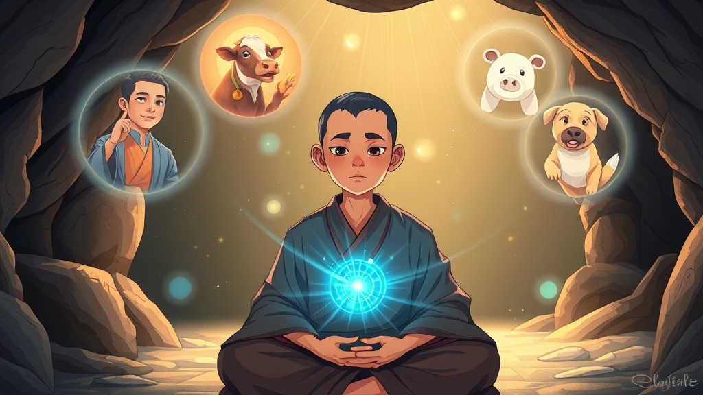 어느 날, 혼자 동굴 앞에서 조용히 생각을 정리하다가 깜빡 잠이 들었죠. 꿈속에서 신비한 빛이 나타나 그의 머리를 쓰다듬으며 잊고 있던 기억들을 깨끗하게 정리해 주는 것 같았대요. 꿈에서 깬 스님은 놀라운 능력이 생긴 걸 알게 됐어요. 마치 특별한 **'시간 여행자의 안경'**을 쓴 것처럼, 아주 먼 옛날부터 지금의 자신까지, 모든 자신의 모습을 생생하게 볼 수 있게 된 거죠!