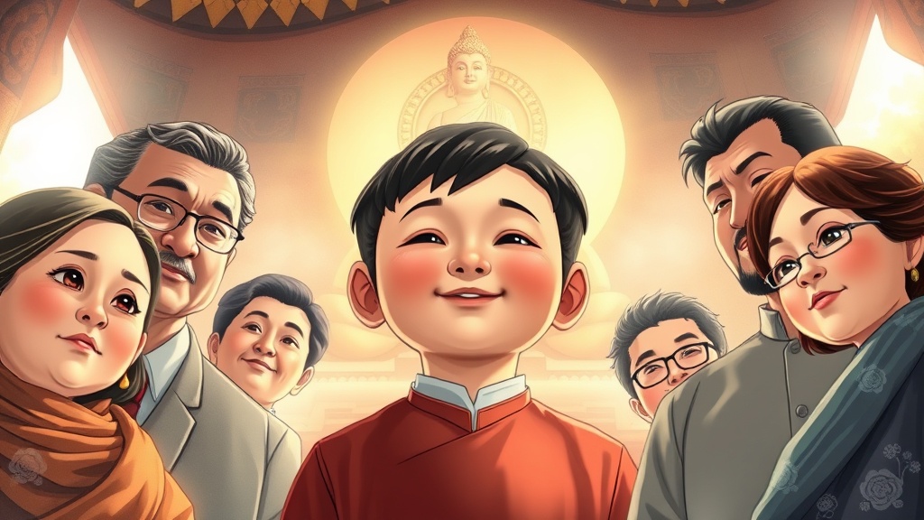 한글원문 (Original Korean) 그러던 어느 날, 무언은 부모님과 친척, 친구들과 함께 영취산에 계신 석가모니 부처님께 예배드리러 갔어요. 부처님 좌우에는 훌륭한 보살님들이 엄숙하고 자비로운 모습으로 앉아 있었지요. 그곳의 장엄한 분위기 속에서 무언은 말로 다 표현할 수 없는 법의 기쁨을 느끼며, 마음 깊은 곳에서 불심이 샘솟는 걸 경험했답니다.