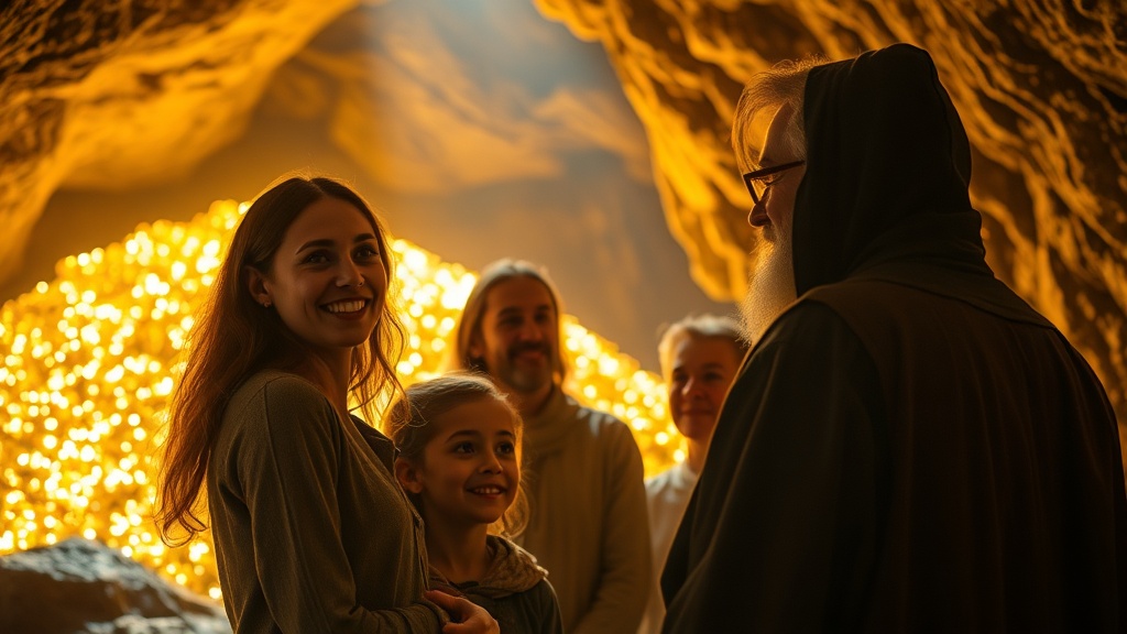 여인과 그 가족들은 환희와 놀라움에 휩싸였습니다. 황금 보물을 꿈에도 몰랐던 터라, 그 낯선 남자를 더없이 귀하게 대접했습니다.