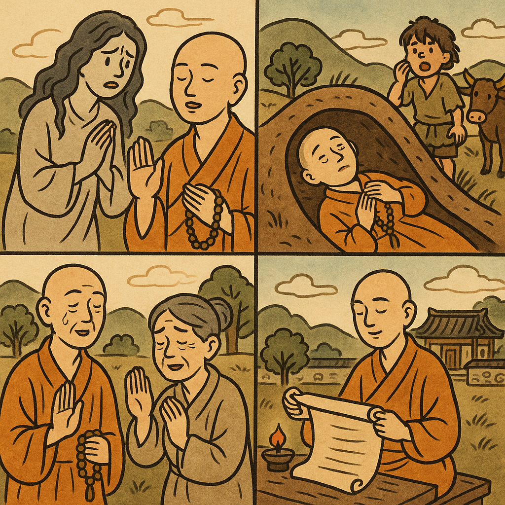 스님께서 인간 세상으로 돌아가신다면, 제 부모에게 이 사실을 알려 그 논을 돌려주도록 해 주십시오. 또 제가 살아 있을 때 참기름을 상자 밑에 묻어 두었고, 고운 베 천을 침구 속에 감춰두었으니, 그것을 찾아 불등(佛燈)에 기름을 올리고 베는 팔아 경폭(經幅)을 만들어주십시오. 그러면 저 또한 이 고통에서 벗어날 수 있을 것입니다.”
