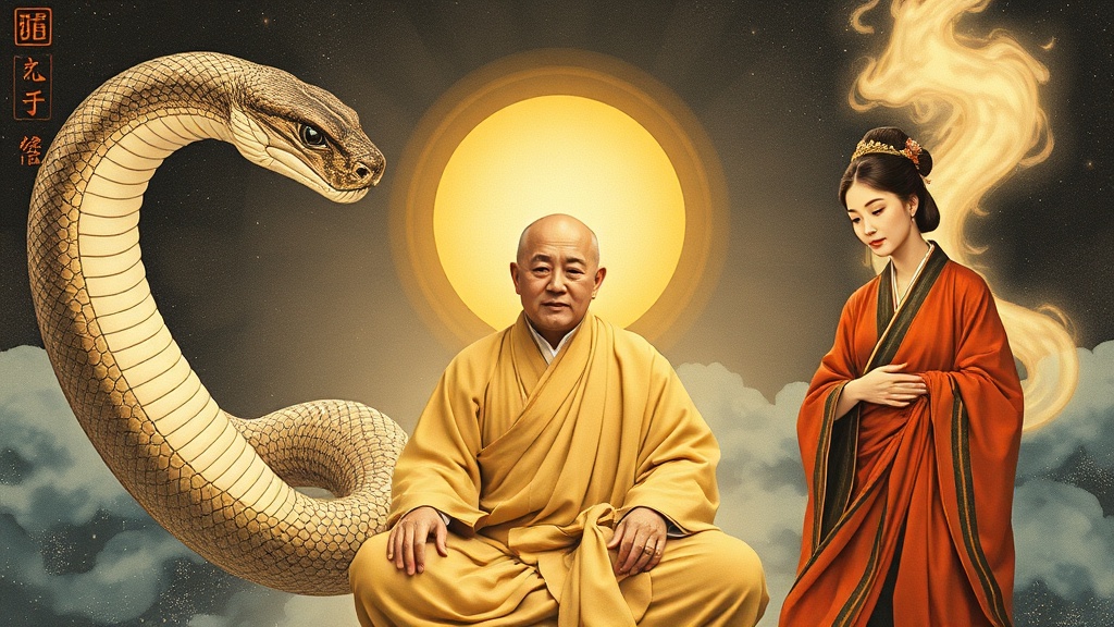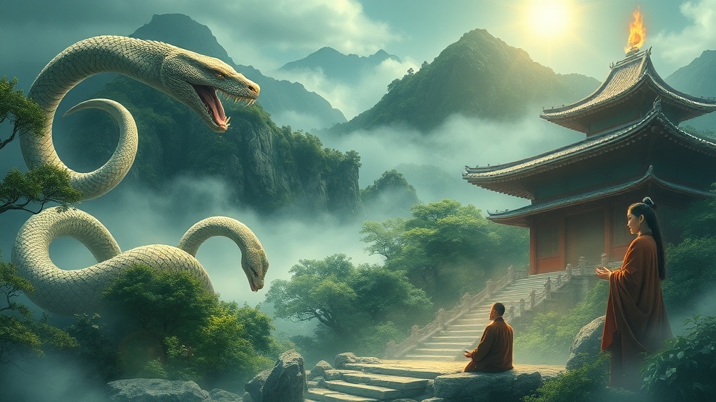 - Simplified Chinese (慈悲心 - Cíbēixīn): 佛教的核心教义之一,指希望一切众生离苦得乐的心情。它不仅仅是同情,更是积极地给予帮助和快乐的深沉情感。洪照僧人面对巨蟒时,从惊恐转为慈悲念诵经文,便是这种心境的体现。