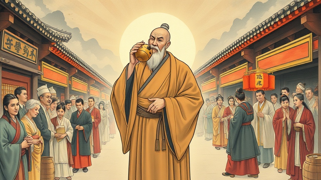 - English Image Prompt: Oriental painting style. In a bustling marketplace, neat commoner-clothed Soseong Geosa Wonhyo dances cheerfully, playing Muae. People around him show mixed reactions—some joyful, others curious or even scornful. The background features cool colors, suggesting a strict societal atmosphere of the time.