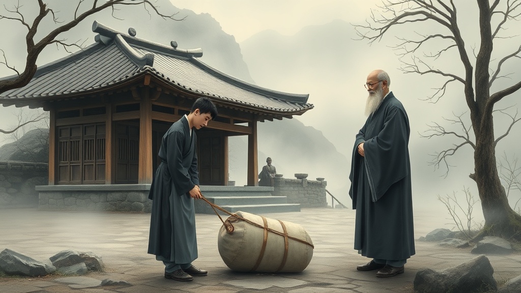 - Introduction Image Prompt (English): Deep in Jirisan, before a tranquil and mysterious hermitage, young Choi Un-hak, neatly dressed in simple Hanbok, lays down his burdens and bows, declaring his intent to renounce secular life to Senior Monk Sungin. Sungin greets him with a benevolent smile, against a misty mountain temple backdrop in an East Asian painting style. Please ensure characters are dressed.