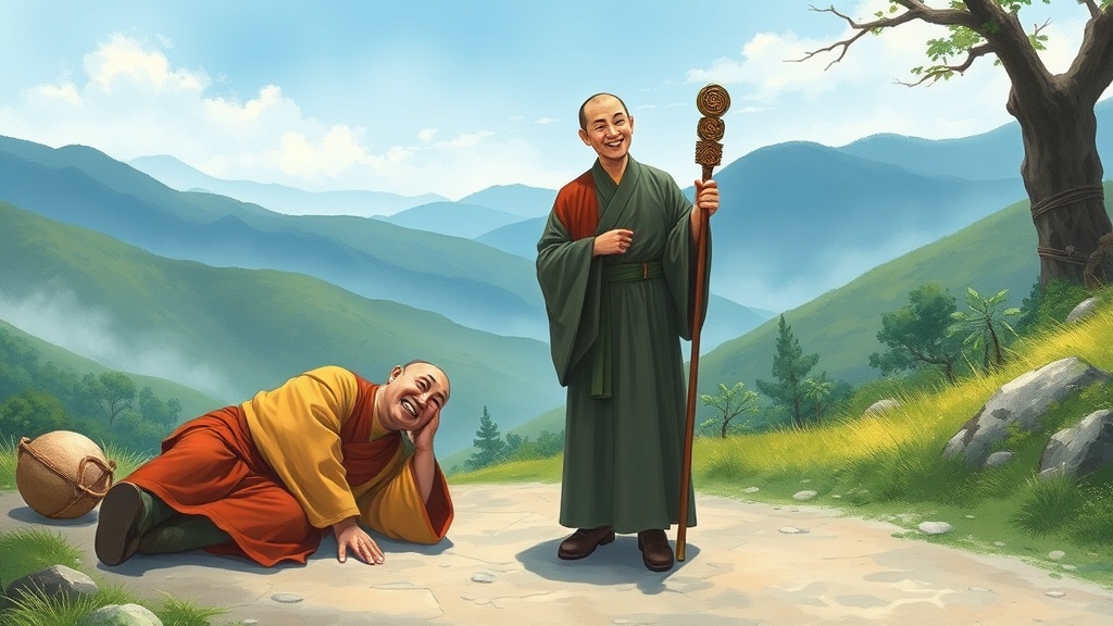 - [English Prompt] An East Asian painting collage: A junior monk (in neat monastic robes), exhausted and collapsed with a heavy burden on a tranquil mountain path. Next to him, Gyeongheo Seunim (in neat monastic robes) stands with his staff. The subsequent scene shows both monks facing each other, laughing heartily and enlightened, set against a peaceful natural background.