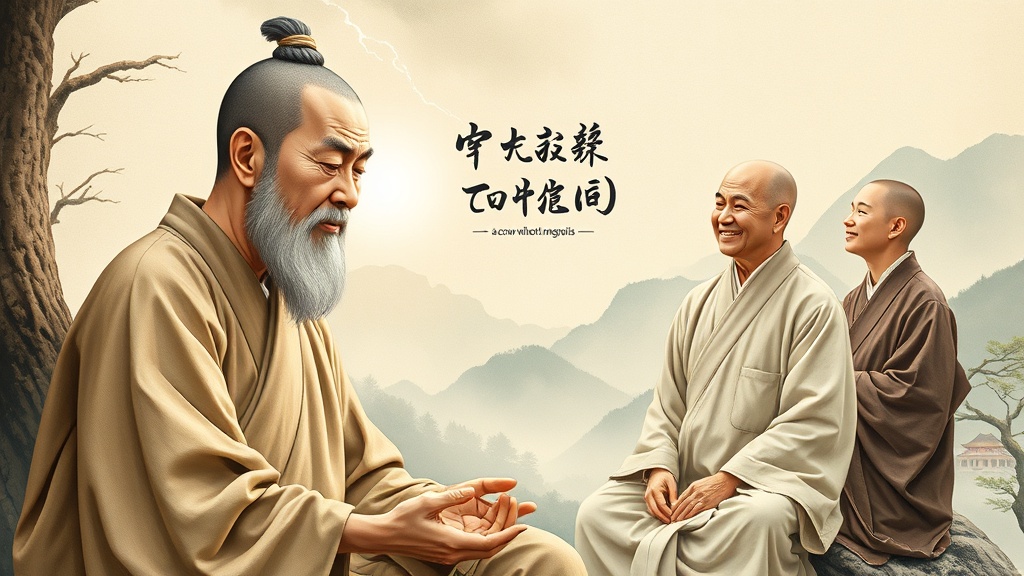 [한국어] 동양화풍으로 경허 스님이 고뇌 속에 정진하는 모습, 그리고 "콧구멍 없는 소"라는 말에 번개처럼 빛이 터져 나오는 깨달음의 순간을 묘사해 주세요. 이후 무거운 짐을 진 상좌와 경허 스님이 마주 보며 해탈한 듯 함께 웃는 콜라주 이미지로 표현합니다. 모든 인물은 단정한 승복을 입고 있으며, 배경은 고즈넉한 산사와 고요한 자연 풍경을 담아 평화롭고 지혜로운 분위기를 연출해 주세요.