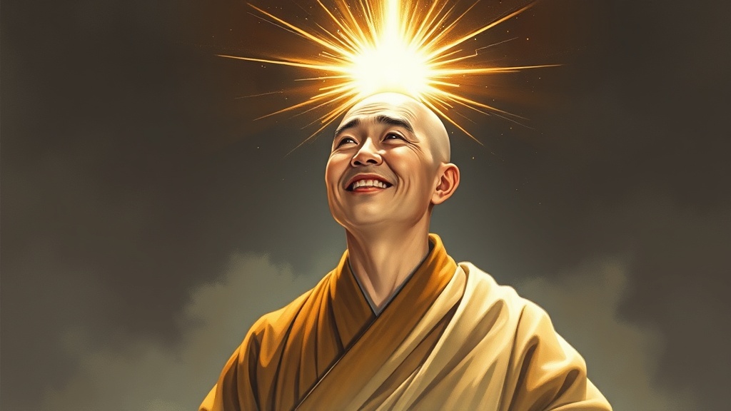 - [한국어] 고뇌 속에 좌선하던 경허 스님(단정한 승복)이 이 처사의 말에 벼락처럼 빛나는 깨달음을 얻는 순간을 동양화풍으로 표현. 스님의 머리 위로 강렬한 금빛 섬광이 터져 오르며, 그의 얼굴에는 환희와 평온이 깃들고, 뒤로는 고뇌의 그림자가 사라집니다. 옷은 단정한 승복을 입고 있습니다.