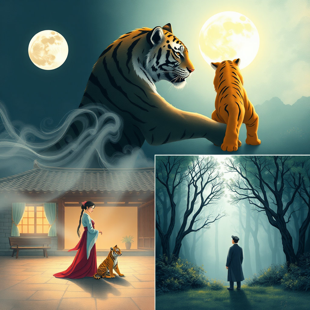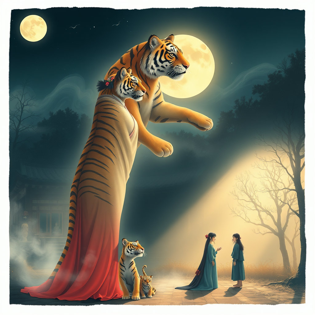 마침내 아내는 호랑이 가죽을 집어 들어 온몸에 뒤집어썼습니다. 그러자 그녀는 곧바로 거대한 호랑이로 변했고, 으르렁거리며 날카로운 발톱으로 할퀴더니 문을 박차고 밖으로 사라져 버렸습니다.