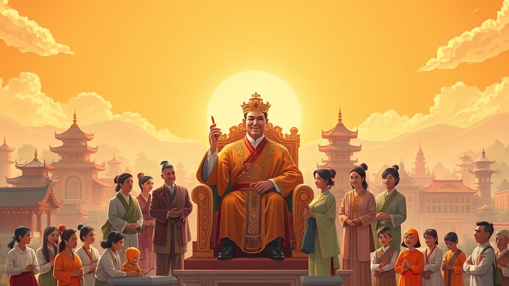 이미지 생성 정보 (한글): 황금빛 햇살이 쏟아지는 평화로운 인도 대륙 중앙에, 단정하고 위엄 있는 복장을 한 계일왕이 왕좌에 앉아 있습니다. 한 손에는 깨달음을 상징하는 불꽃을, 다른 손에는 번영을 상징하는 씨앗을 들고 있습니다. 그의 주변으로는 단정한 옷을 입은 다양한 국적과 계층의 백성들이 교육과 자선을 통해 조화롭게 어우러지고 있습니다. 배경에는 번성한 사원, 요양원, 학교가 어우러진 이상적인 도시 풍경이 펼쳐지며, 하늘에는 현장 스님과 당나라 사신의 실루엣이 평화롭게 교류하는 모습이 보입니다.