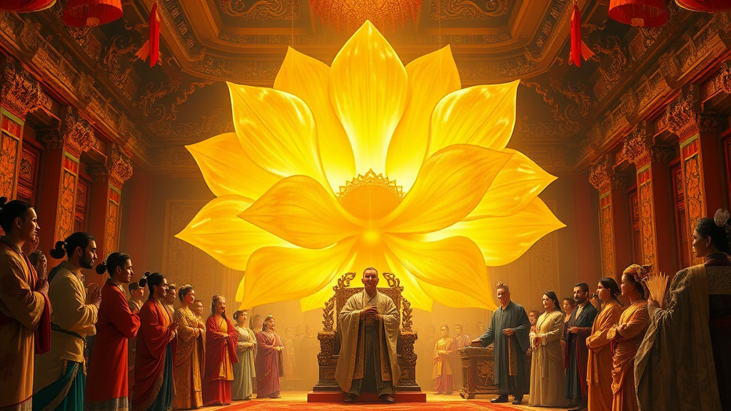 며칠 뒤, 궁전 앞에 또 하나의 기이한 일이 일어났다. 아홉 빛깔을 품은 금빛 꽃 한 송이가 하늘에서 춤을 추듯 내려온 것이다. 신하들은 또다시 “이번이야말로 대길조”라며 환호했다. 그러나 장자는 또 침묵했다.