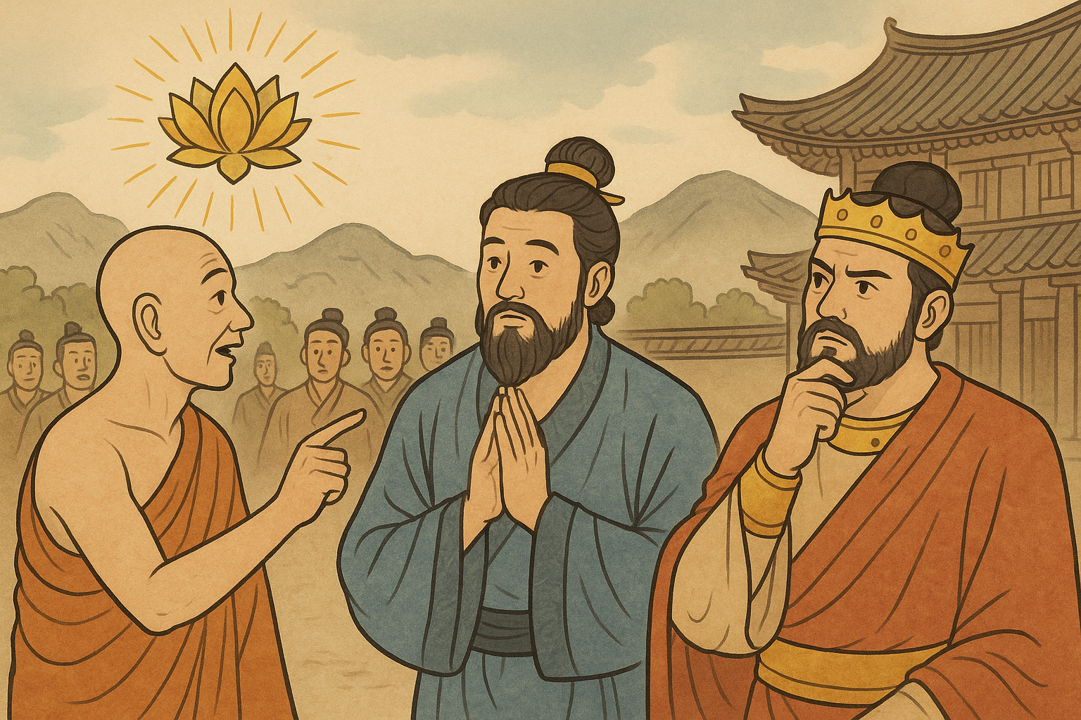 신하들 중에는 쥬다이카 장자도 있었다. 왕이 수건을 보고 “이게 무슨 상징이냐?”고 묻자, 신하들은 입을 모아 이렇게 말했다.