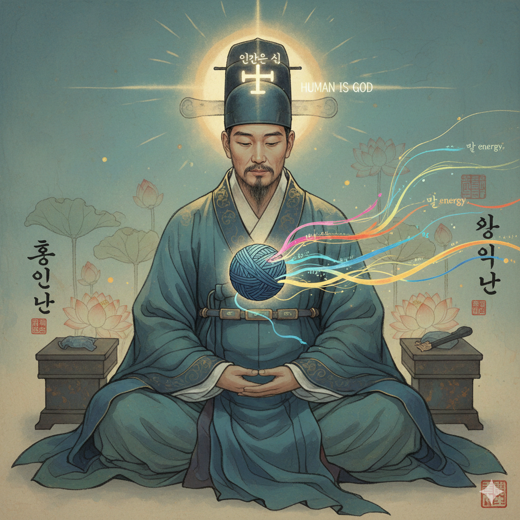 - English Prompt: In a serene, spiritual East Asian style study, a neatly dressed scholar sits in peaceful meditation. Above their head, a symbol glowing like "gentry" (벼슬) with the text "Human is Divine" (인간은 신) radiates as an aura. From their chest, dark blue tangled threads, symbolizing "stiflement," slowly unravel into vibrant, luminous "word" energies. Lotus motifs and "Hongik Ingan" characters harmoniously glow in the background, visualizing a journey from contemplation to enlightenment.