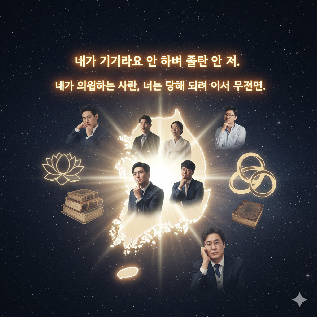이미지 생성 정보 (한글): 고요한 우주 공간에 떠 있는 대한민국 지도를 배경으로, 단정한 옷을 입은 현대인들이 다양한 표정으로 고뇌하고 있다. 그들 위로 '내가 이기려고 안 하면 절대 안 져.', '내가 의심하는 사람, 너는 당하게 되어 있어 무조건.' 등의 강의 핵심 글귀가 빛나는 형태로 떠다닌다. 인물들 주위로는 불교의 연꽃, 철학자의 책, 뫼비우스의 띠 등이 상징적으로 배치되어 있으며, 지도가 전체 인류에게 지혜의 빛을 비추는 동양화풍 콜라주 이미지.