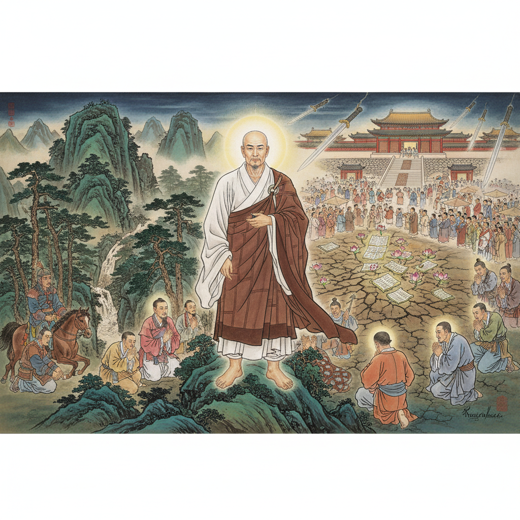 - 요약: 담시 스님은 불경을 짊어지고 고구려에 불교의 씨앗을 뿌렸고, 이후 관중으로 돌아와 갈 곳 잃은 이들을 구제하며 청정한 본성으로 '백족화상'이라 불렸습니다. 흉노족 혁련발발의 칼날이 스님을 해치지 못하고 굴복시키는 기적을 보였으며, 북위의 불교 탄압 시기에는 척발도 황제의 칼날과 맹수들 앞에서도 흔들림 없는 위엄을 보여 탄압을 중단시키고 불법을 중흥시켰습니다. 스님의 일생은 철저한 두타행으로 다져진 내면의 힘을 증명했습니다.