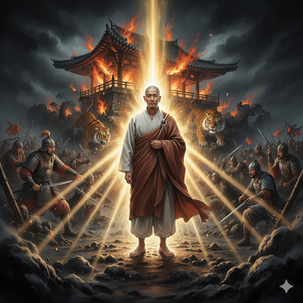 어리석음의 폭풍 속, 척발도의 검은 그림자 속세의 혼란 속에서도 스님은 홀로 당당히 청정한 마음으로 모든 시련을 녹였네