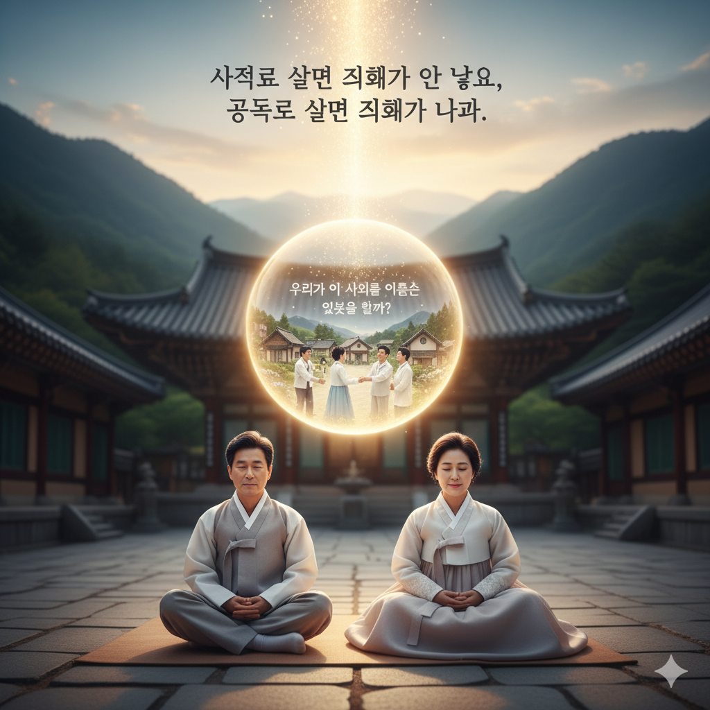 고요한 산사 마당에서, 단정하게 옷을 입은 중년 남녀가 차분하게 앉아 명상하고 있다. 그들 위로는 '사적으로 살면 지혜가 안 나오고, 공적으로 살면 지혜가 나와.'라는 한글 문구가 빛처럼 흐르며, 그 빛이 '우리가 이 사회를 위해서 무엇을 할까?'라는 글귀가 새겨진 투명한 구슬을 비춘다. 구슬 안에는 작은 마을(사회)이 보이고, 그 안에서 단정하게 옷을 입은 사람들이 서로 돕고 웃고 있다. 인물들의 얼굴은 평온하고 지혜로우며, 따뜻한 빛이 이들을 감싸고 있다. 구글 나노 바나나 스타일의 영적이고 성찰적인 분위기.