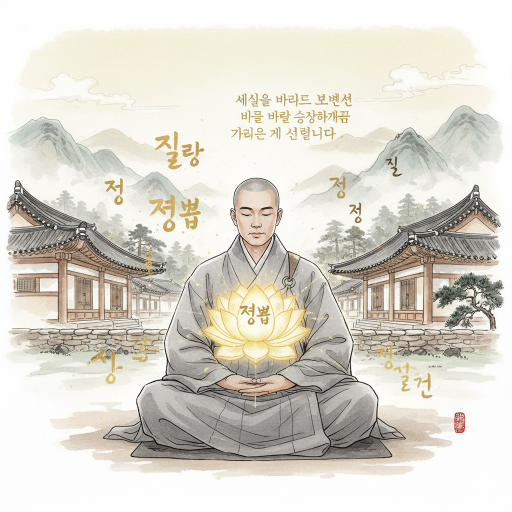 - 철학적/불교적 요소 이미지 생성 정보 (300자 내외): 고요한 동양화풍의 산사에서 단정하게 승복을 입은 승려가 좌선하고 있다. 그의 내면에서는 황금빛 빛이 피어올라 '질량', '정법', '정견'이라는 글자들로 이루어진 연꽃이 만개한다. 이 빛은 세상을 바르게 보는 지혜를 상징하며, 주위에는 '세상을 바르게 보면서 바르게 성장하게끔 가르치는 게 선물입니다'라는 글귀가 아지랑이처럼 떠오른다.
