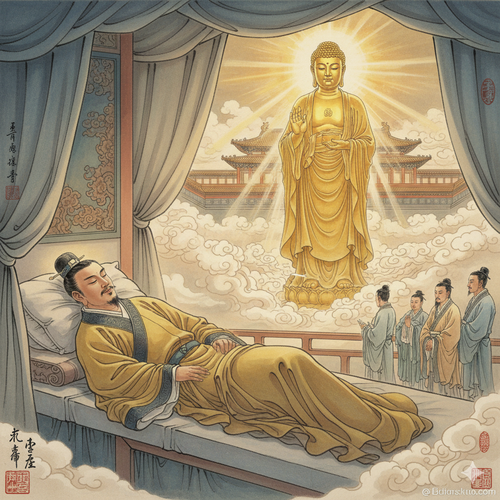영평 7년(서기 64년) 정월 어느 날 밤, 만물을 다스리던 한나라의 효명 황제는 깊은 잠에 들었습니다. 꿈속에서 그의 눈앞에 갑자기 나타난 것은, 열 길(약 24미터)에 달하는 거대한 키와 온몸에서 황금빛 광채를 내뿜는 신비로운 존재였습니다. 그 황금빛 사람은 황제의 궁궐 마당에 부드럽게 내려앉아, 마치 세상 전체를 밝히는 것 같았습니다. 그 빛은 단순한 햇살이 아니라, 한없는 지혜와 자비가 고스란히 담긴 경이로운 빛이었습니다. 황제는 꿈에서 깨어난 뒤에도 그 인상적인 모습이 마음에서 떠나지 않았고, 가슴 한켠에서는 뜨거운 감동과 함께 알 수 없는 궁금증이 솟구쳤습니다.