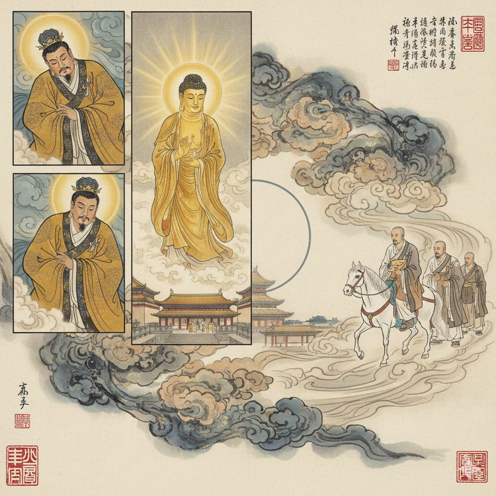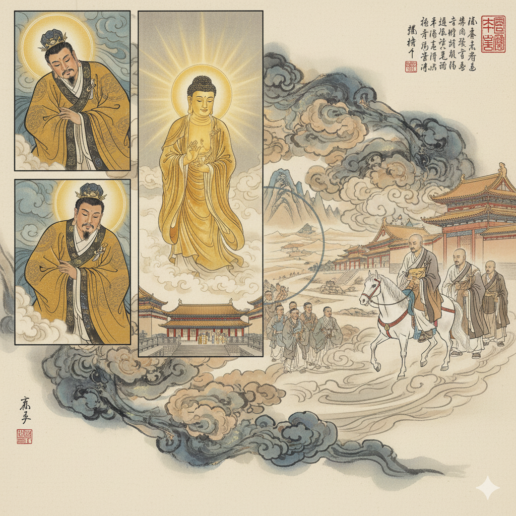 한나라 효명 황제는 서기 64년 어느 날 밤, 꿈속에서 키 열 길에 온몸에서 황금빛 광채를 내뿜는 신비로운 존재를 만납니다. 꿈에서 깨어난 황제는 깊은 감동과 궁금증에 휩싸이고, 다음 날 신하들을 불러 꿈 이야기를 나눕니다. 박식한 태사 부의는 『주서이기』의 "서역에서 위대한 성인이 태어나 천 년 후 그 가르침이 동방으로 전해질 것"이라는 예언을 인용하며, 황제의 꿈이 불법 도래의 징조라고 해석합니다.