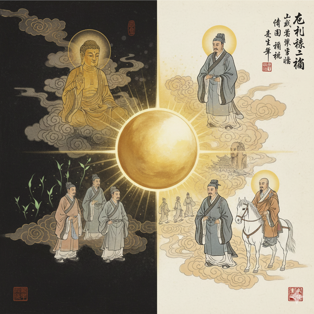 한글: 동양화풍의 추상적이고 철학적인 콜라주. 중앙에는 신비로운 황금빛이 감도는 지혜의 빛을 상징하는 거대한 구체가 떠 있고, 그 주변으로 희미하게 효명 황제의 꿈속 황금빛 존재, 박식한 태사 부의의 지혜로운 눈빛, 서역으로 향하는 사신단의 굳건한 발걸음, 백마를 탄 마등과 법란 스님의 모습이 조화롭게 배치된다. 배경은 점차적으로 어둠에서 밝고 희망찬 빛으로 전환되며, 동방에 뿌려진 깨달음의 씨앗이 새싹으로 돋아나는 듯한 이미지를 더한다. 모든 인물들은 각자의 역할에 맞는 단정한 옷을 입고 있다.