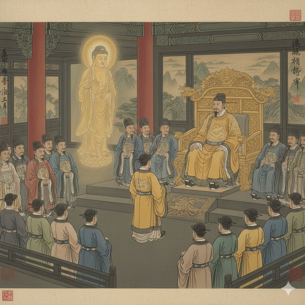 한글: 한나라 궁궐의 근엄한 조회실. 단정하고 화려한 한푸를 입은 효명 황제가 용상에 앉아 있고, 그 앞에 도열한 신하들이 경청하고 있다. 태사 부의가 손을 모아 조심스럽지만 확신에 찬 표정으로 이야기하고 있으며, 그의 뒤로 희미하게 빛나는 황금빛 부처님 형상이 공중에 떠 있는 듯 연기처럼 피어난다. 모든 인물들은 단정한 한푸를 입고 있으며, 진지한 분위기 속에서 황제의 꿈 이야기가 풀려나가는 순간을 동양화풍으로 표현한다.