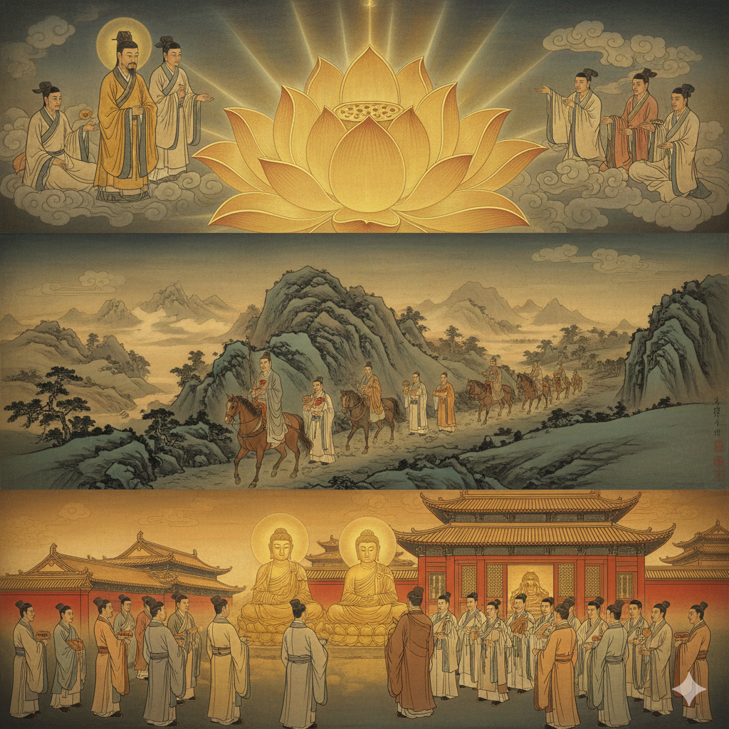 한글: 고요하고 영적인 동양화풍의 콜라주. 중앙에 활짝 피어난 거대한 황금 연꽃이 동방의 하늘을 비추고, 그 아래에 삼단 구도로 나뉘어 이야기가 전개된다. 상단에는 잠든 황제 위로 황금빛 존재가 내려서는 신비로운 꿈 장면. 중간에는 실크로드의 험준한 길을 걷는 단정한 사신단과 승려들의 만남. 하단에는 화려한 궁궐에서 황제가 불상과 불경을 감격스럽게 맞이하는 모습이 조화롭게 연결되며, 불교 전래의 장엄한 여정과 깨달음의 빛이 동방에 드리우는 희망찬 비전을 표현한다. 모든 인물들은 각자의 역할에 맞는 단정한 옷을 입고 있다.