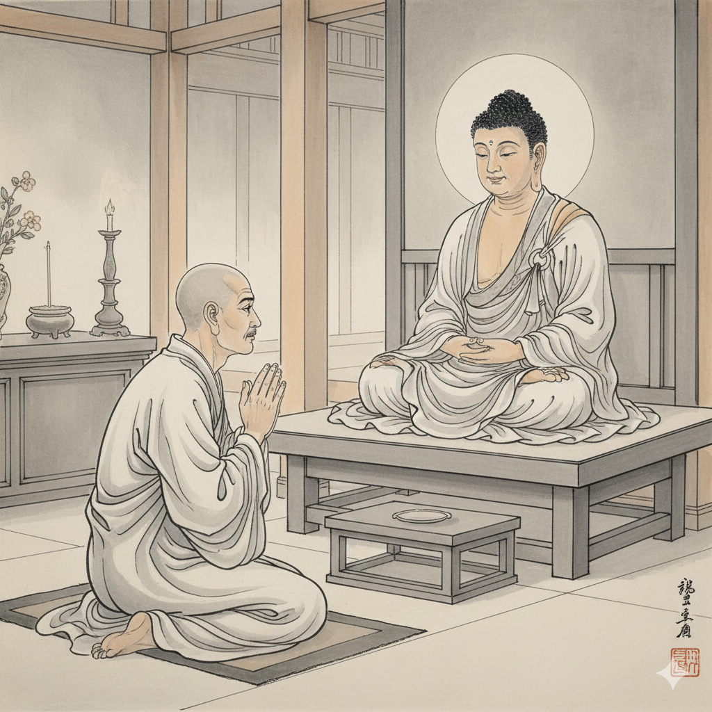 - 이미지 생성 프롬프트: 한글 Prompt: 석가모니 부처님 앞에서 단정한 옷차림의 수보리가 염려 가득한 눈빛으로 두 손을 모아 질문하는 모습입니다. 부처님께서는 인자한 미소를 지으며 수보리를 바라봅니다. 배경은 차분하고 고요한 동양화풍의 사찰 내부로, 인물들의 감정선이 강조됩니다.