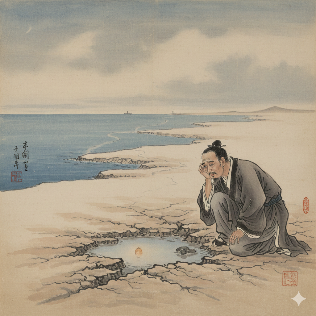 - 이미지 생성 프롬프트: 한글 Prompt: 넓게 펼쳐진 푸른 대양과 대비되는 황량한 땅 위에 작은 소 발자국 웅덩이가 보입니다. 단정한 옷차림의 인물이 무릎을 꿇고 그 웅덩이를 심각하게 들여다보며 고뇌하는 모습이 동양화풍으로 그려집니다. 인물의 옆으로는 바다를 향한 길이 흐릿하게 펼쳐져 있어, 선택의 갈림길을 암시합니다.