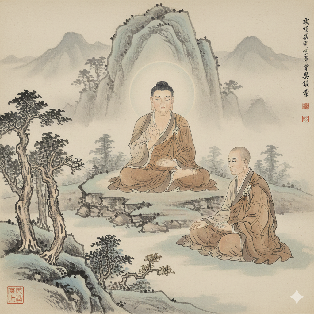 - English Prompt: On the serene Vulture Peak, Shakyamuni Buddha in neat monastic robes gently addresses Subhuti. A soft aura of enlightenment surrounds the Buddha, while Subhuti listens intently. The scene is rendered in a tranquil East Asian ink wash style, with both figures wearing tidy traditional clothing.