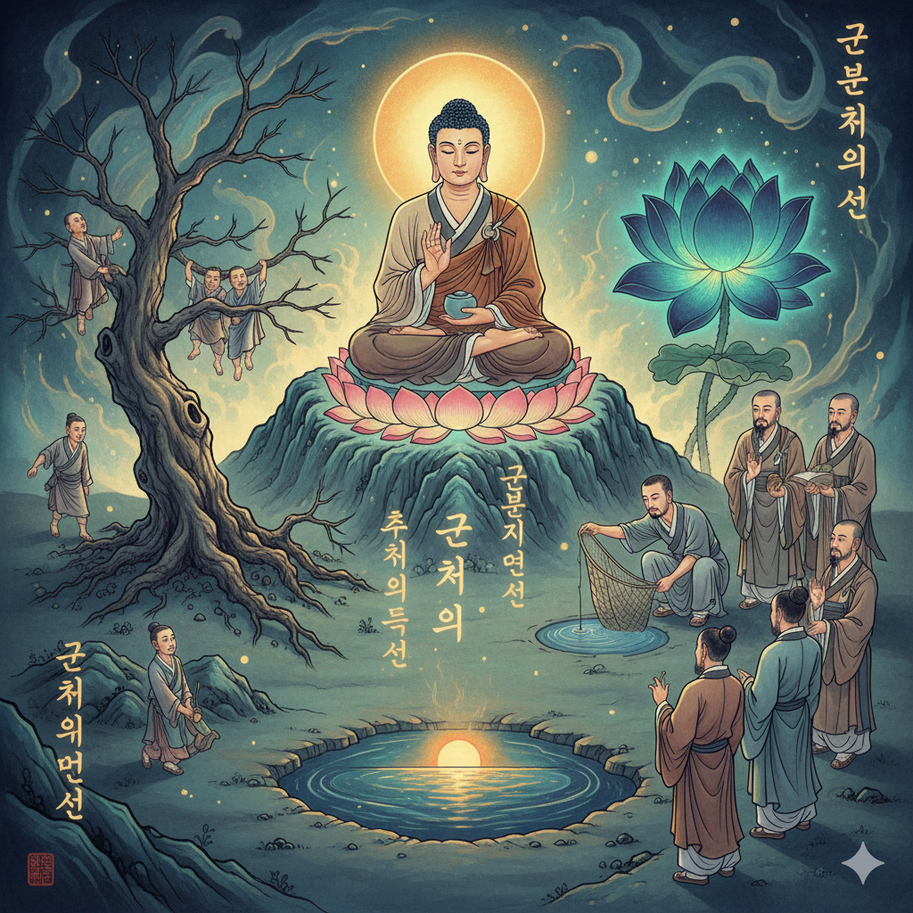 가장 중요한 포인트 이미지 생성 프롬프트: 한글 Prompt: 고요한 동양화풍의 우주 공간, 중앙에 뿌리 깊고 웅장한 '반야(Prajna)' 연꽃이 황금빛으로 찬란하게 빛납니다. 그 주위로 수많은 길들이 갈라져 있지만, 대부분은 앙상한 가지나 흐릿한 환상으로 이어지고, 오직 한 줄기 빛나는 길이 반야의 연꽃으로 향합니다. 단정한 승복 차림의 부처님(강사)이 이 연꽃을 가리키며 단정하게 옷을 입은 제자들(학생들)에게 진정한 지혜의 길을 설법하고 있습니다. English Prompt: In a serene East Asian ink wash style cosmic space, a magnificent golden 'Prajna' lotus with deep roots shines brightly at the center. Numerous paths diverge around it, but most lead to barren branches or blurry illusions; only one luminous path leads to the Prajna lotus. Buddha (lecturer) in neat monastic robes points to this lotus, teaching the path of true wisdom to neatly dressed disciples (students).