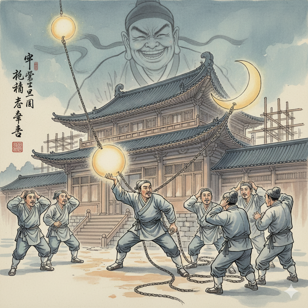 - 이미지 생성 프롬프트: 한글 Prompt: 동양화풍으로 웅장하게 그려진 제석천 궁전의 건축 현장입니다. 단정한 작업복을 입은 장인이 비현실적으로 해와 달을 끌어와 건축에 사용하려 합니다. 주변의 다른 장인들은 어리석다는 듯 고개를 젓고 있고, 허황된 시도를 조롱하는 듯한 흐릿한 배경의 웃는 그림자가 비칩니다.