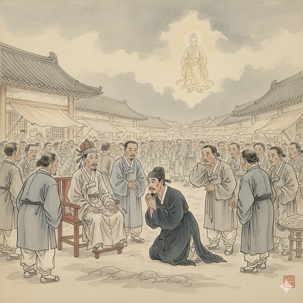 - 이미지 생성 프롬프트: 한글 Prompt: 번화한 시장 한복판, 단정한 전통 복장을 한 인물들이 웅성거립니다. 한쪽에는 초라한 작은 나라의 임금이 어설픈 왕관을 쓰고 앉아 있고, 다른 쪽에는 단정하게 옷을 입은 탐구자가 그를 전륜성왕이라 착각하며 맹목적으로 따르려는 모습이 동양화풍으로 그려집니다. 멀리 희미하게 진정한 전륜성왕의 위엄 있는 형상이 보입니다.
