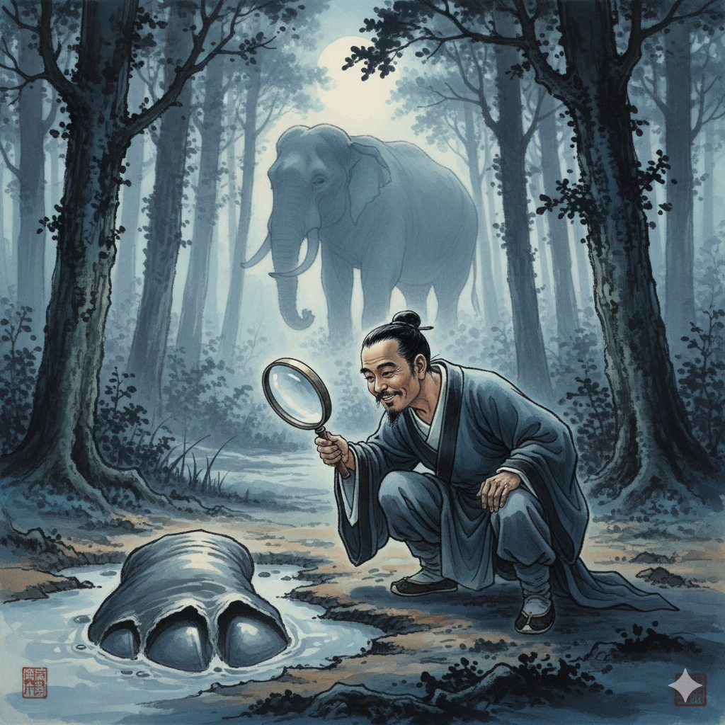 - English Prompt: In a lush forest, clear giant elephant footprints are visible. A neatly dressed person with a magnifying glass diligently examines only the footprints, wearing a satisfied expression. Far in the background, the faint silhouette of an entire elephant creates a striking contrast. The overall style is a mystical East Asian ink wash.