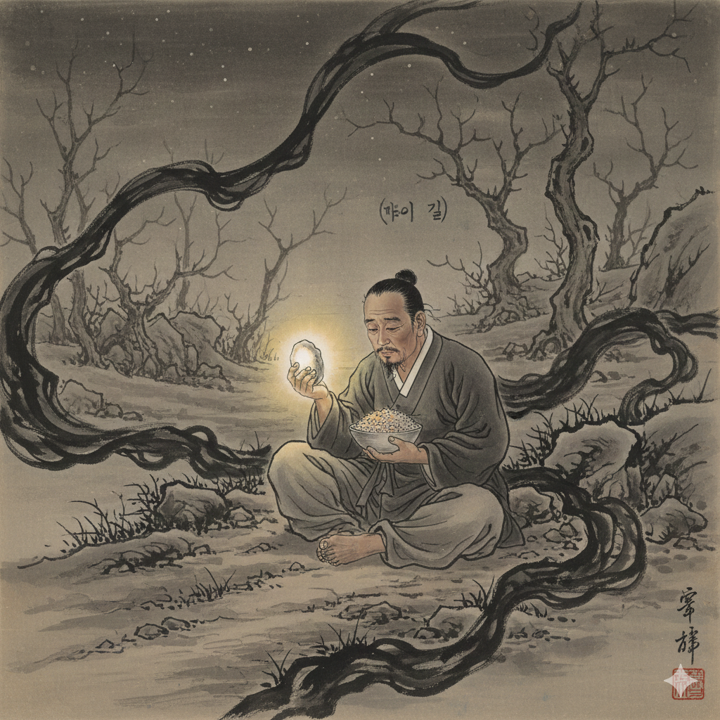 - 이미지 생성 프롬프트: 한글 Prompt: 어둡고 황량한 길가에 단정한 옷차림의 인물이 앉아 맛없는 밥을 먹고 있습니다. 그의 손에는 찬란한 빛을 내뿜는 마니주가 쥐어져 있지만, 인물은 그것이 평범한 돌멩이인 줄 알고 무관심하게 보고 있습니다. 배경에는 '마의 길'을 상징하는 음침한 기운이 동양화풍으로 묘사됩니다.