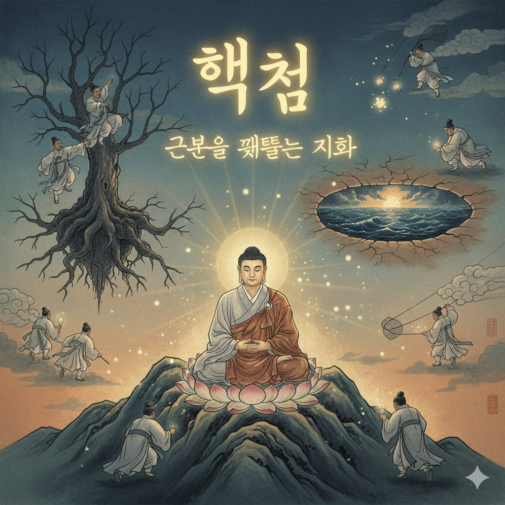 배울 점 & 시사점: 이 설화는 문제 해결이나 성장의 근본 원인을 파악하는 것이 얼마나 중요한지를 가르쳐줍니다. 겉으로 드러나는 현상이나 지엽적인 것에만 매달리는 것은 결국 시간을 낭비하고 진정한 목표에 도달하지 못하게 합니다. 특히, 정보가 넘쳐나는 현대사회에서 핵심을 꿰뚫는 통찰력인 '반야'의 중요성을 깨닫게 합니다.