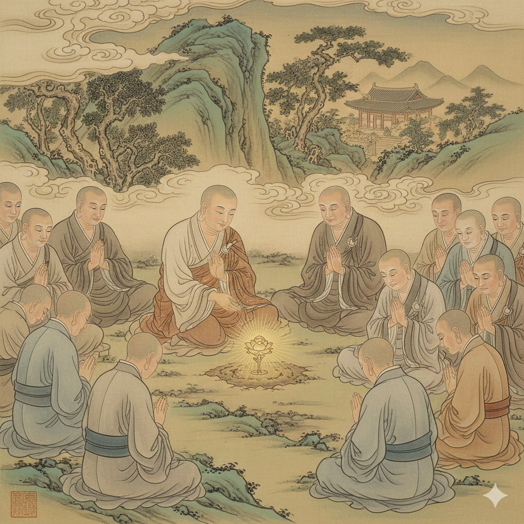 이미지 생성 프롬프트: 한글 Prompt: 고요하고 신비로운 동양화풍의 산사 마당. 단정한 승복을 입은 부처님과 제자들이 앉아 있고, 그들의 주변 공중에 강조 문구들이 황금빛으로 홀로그램처럼 떠 있습니다. "반야를 저버리는 것은 번뇌", "뿌리 뽑고 가지 오르기", "소 발자국 웅덩이로 바다 보기" 등 문구들이 유동적으로 나타났다 사라집니다. 모든 인물은 단정한 옷을 입고 있으며, 명상하는 듯한 평화로운 분위기입니다. English Prompt: A serene, mystical East Asian ink wash style temple courtyard. Buddha in neat monastic robes and disciples sit, surrounded by golden, holographic emphasized sentences floating in the air: "Abandoning Prajna is affliction," "Climbing branches without roots," "Seeing the ocean in a hoofprint puddle." All figures are neatly dressed in a peaceful, meditative atmosphere.
