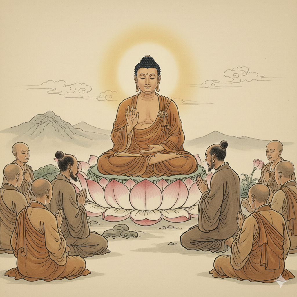 옛날 라자카하 영취산에서는 석가모니 부처님께서 많은 대중 앞에서 진리의 법문을 전하고 계셨습니다. 그곳은 부처님의 지혜로운 말씀이 은은히 퍼지며 평화가 깃든 자리였죠.