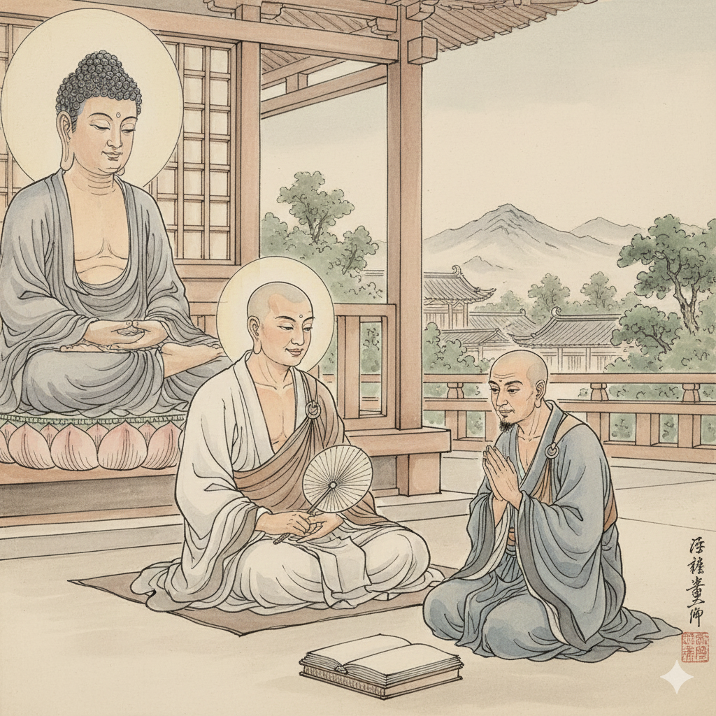 이미지 정보 (한글): 석가모니 부처님 곁에서 단정한 옷을 입고 부채질하던 아난 존자가 우쵸쿠를 향해 부드럽게 고개를 돌리며 따스하고 차분한 표정으로 이야기하고 있다. 우쵸쿠는 아난 존자의 말을 경청하는 자세이다. 배경에는 평화로운 사원의 일부가 보인다.