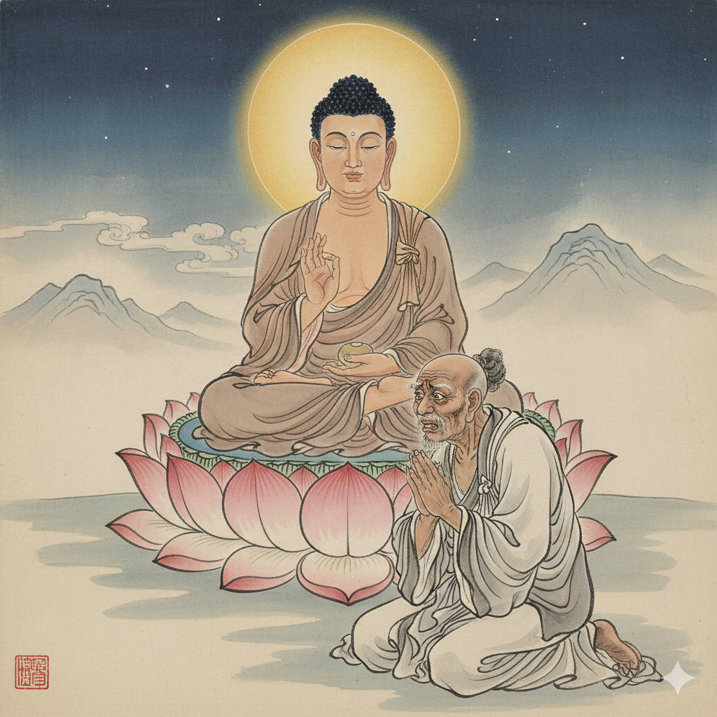 이미지 생성 정보 (300자 내외): 영취산의 평화로운 풍경. 중앙에 연꽃 좌대에 앉은 석가모니 부처님은 고요히 눈을 감고 계시고, 그 앞에 무릎 꿇은 우쵸쿠 바라문은 난처하고 답답한 표정으로 질문하고 있다. 둘 사이의 팽팽한 정적이 감돌며, 은은한 빛이 부처님 주변을 감싼다. 인물들은 단정한 옷을 입고 있으며, 동양화풍이다.