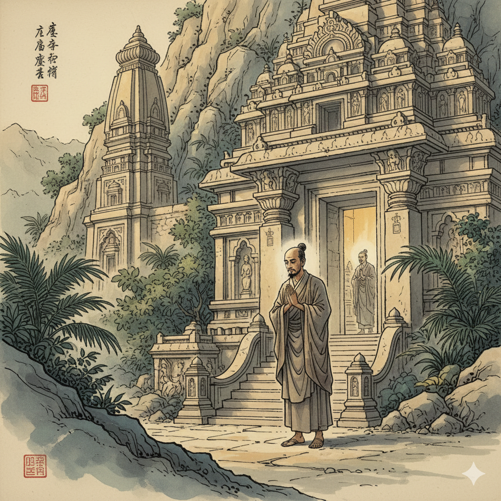 이미지 정보 (한글): 고대 인도 사원 건축물의 입구 근처, 단정하고 고상한 옷을 입은 바라문 학자 우쵸쿠가 공손하게 두 손을 모아 부처님을 향해 다가서는 모습이다. 그의 표정에는 깊은 의문과 경외심이 교차한다. 배경에는 웅장하면서도 신비로운 사원의 모습이 보인다. 인물들은 당시 의상을 단정하게 입고 있다.