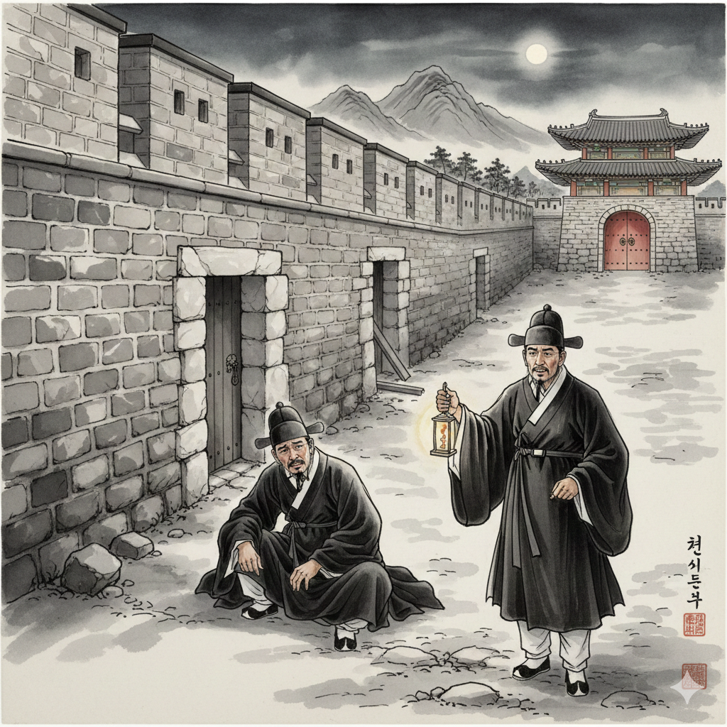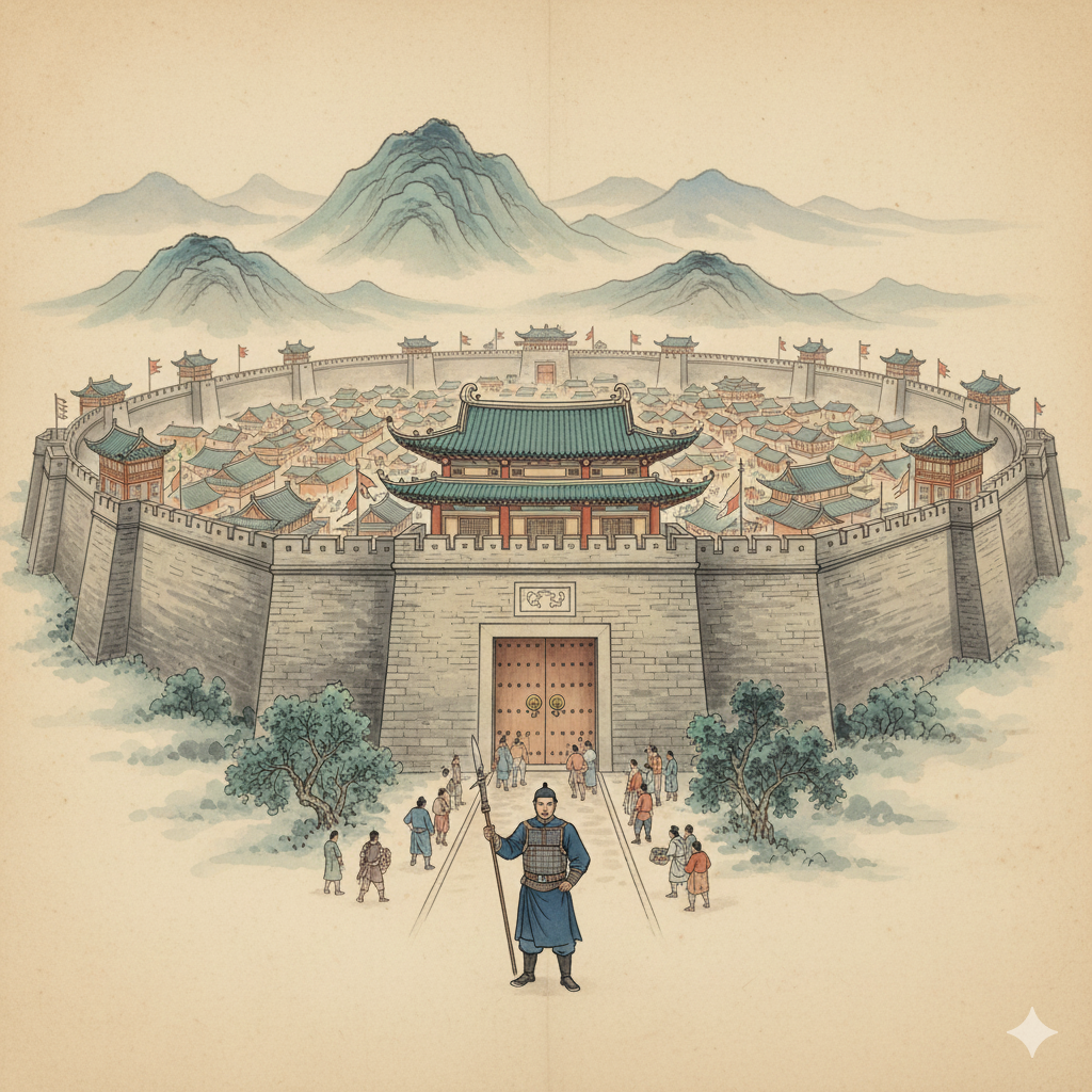 이미지 정보 (한글): 높고 견고한 성벽으로 둘러싸인 번영하는 고대 도시의 파노라마가 동양화풍으로 펼쳐진다. 성벽 중앙에는 크고 웅장하지만 단 하나뿐인 문이 굳건히 서 있으며, 그 문 앞에 단정한 복장의 수문장이 날카로운 눈으로 사람들의 출입을 살피는 모습이다.