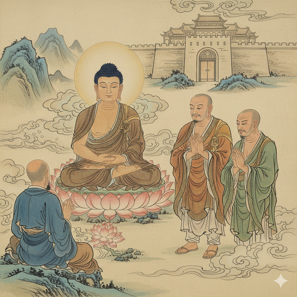 고요한 영취산, 석가모니 부처님께서 연꽃 좌대에 앉아 평화롭게 정면을 응시하며, 곁에는 아난 존자가 지혜로운 미소를 띠고 있습니다. 그의 설명을 듣는 우쵸쿠 바라문은 이해와 깨달음의 표정입니다. 배경으로는 튼튼한 성벽과 고풍스러운 단 하나의 성문이 아스라이 펼쳐지며, 이는 설화의 핵심 메시지를 상징합니다. 모든 인물은 고대 인도 의상을 단정하게 입고 있으며, 전체적으로 명상적이고 지혜로운 동양화풍의 분위기가 강조됩니다.