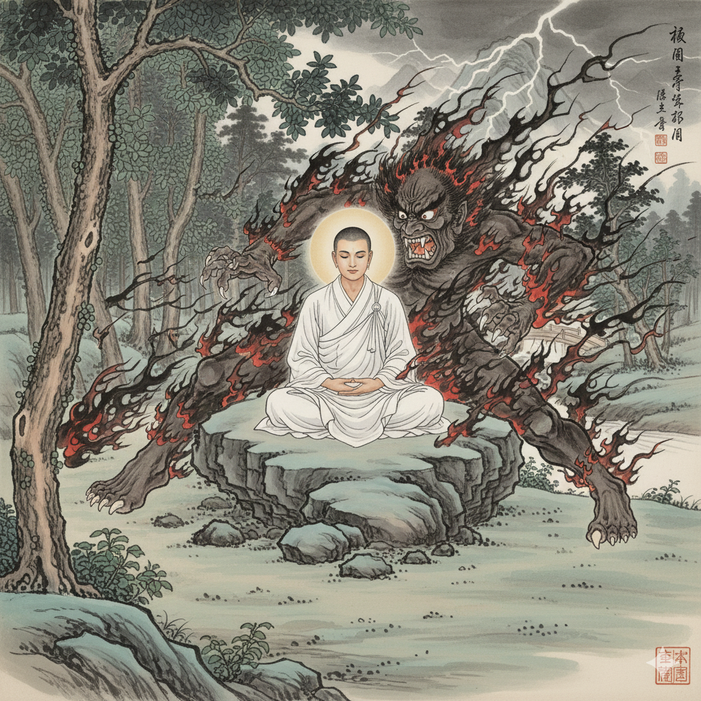- 한글: 고요한 산속 수행터에 어둠과 혼란이 드리워진 동양화풍 이미지입니다. 한편에서는 선인(단정한 흰 도포)이 차분하게 좌정해 있고, 그 앞에 거대하고 흉측한 형상의 마신 파피어스(붉고 검은 기운이 감도는 악마의 형상)가 나타나 성난 표정으로 선인을 위협하고 있습니다. 마신의 등장으로 주변의 나무들이 흔들리고 번개 같은 기운이 퍼지는 역동적인 장면을 연출합니다. 선인의 평온함과 마신의 격렬한 분노가 극명하게 대비되도록 표현해주세요. 마신과 선인 모두 단정한 의상을 착용하고 있습니다. (200자)